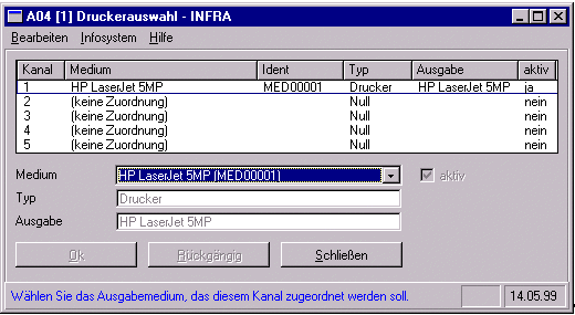 Wenn "Drucker-/Medienauswahl" in einem Druckprogramm aufgerufen wird, wirkt eine Veränderung der Kanalzuordnung bzw. Medienauswahl nur in diesem Programm. Sobald das Druckprogramm beendet wird, werden wieder die alten Zuordnungen verwendet. Um die Medienauswahl für alle Druckprogramme zu ändern, muss "Drucker-/Medienauswahl" im infra-Hauptfenster gestartet werden.