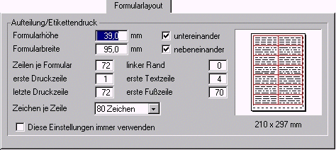 Die Angabe einer Formularbreite wird dann wichtig, wenn Sie Etiketten bedrucken möchten. Dann geben Sie hier den Abstand vom linken Rand des ersten Etiketts zum linken Rand des nächsten Etiketts an.