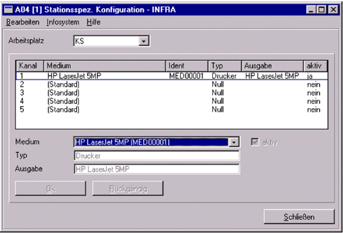 In der oberen Auswahlliste wird der infra-Arbeitsplatz gewählt, für den eine spezielle Ausgabemedienzuordnung getroffen werden soll. Wird der gewünschte Arbeitsplatz dort nicht angezeigt, kann der Stationsnamen des betreffenden Arbeitsplatzes eingegeben werden.