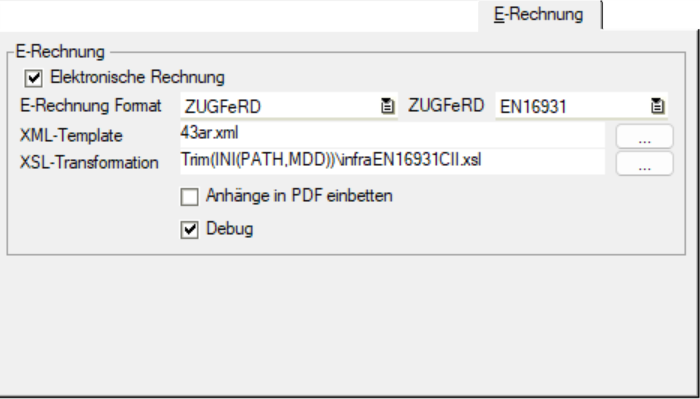 Um Fehler beim Umwandlungsprozess von XML-Daten aus der infra:NET Druckausgabe in das Zielformat der E-Rechnung ausfindig zu machen, kann hier der Debug-Modus aktiviert werden. Im Debug-Modus werden vor der Umwandlung ins E-Rechnungsformat die gesammelten Daten des Rechnungs- bzw. Gutschrift-Drucks in einer zusätzlichen XML-Datei im Zielverzeichnis abgestellt. Der Name der Debug-Datei wird aus dem Namen der Zieldatei (Dateiname aus Register "Datei") gefolgt von "-debug.xml" erstellt.