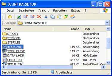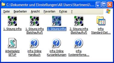 Nachdem das Arbeitsplatz-SETUP durch Doppelklick auf SETUP/STPRUN.EXE im Unterverzeichnis SETUP, oder durch das Programmsymbol „Arbeitsplatz SETUP im infra-Programmordner gestartet wurde, können Programmsymbole für individuelle Datenmanipulationen durch die Option „ 2 individuelle Datenmanipulationen einrichten“ erzeugt werden.