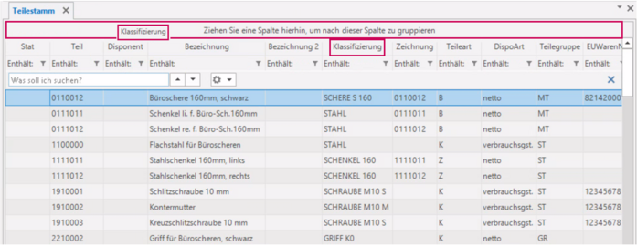 In der Zeile über den Spalten (infra-Felder) kann nach einzelnen Feldern gruppiert werden. Dazu muss eine ausgewählte Spalte mit der linken Maus angeklickt und in die Zeile gezogen werden. Es kann auch in mehreren Ebenen gruppiert werden. Dazu den Vorgang wiederholen. Alternativ kann eine Gruppierung auch über den Menüeintrag (Auswahl Spalte mit rechter Maustaste – zum Öffnen der Menüstruktur).