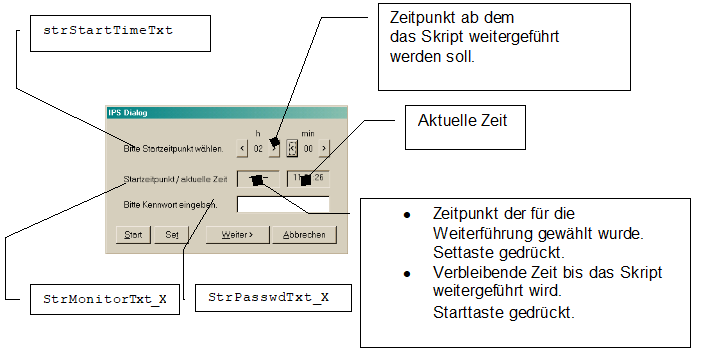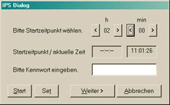 ![]() Als erstes wird ein Startzeitpunkt gewählt. Den Startzeitpunkt können Sie ändern, indem sie auf die entsprechen Taste drücken, z.B. um die Weiterführung des Skriptes um eine Stunde zu verschieben, drücken Sie im Stundenfeld „h“ auf die Taste „>“