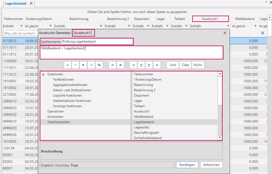 Beispiel (Screenshots): Prüfung ob Meldebestand kleiner Lagerbestand ist.