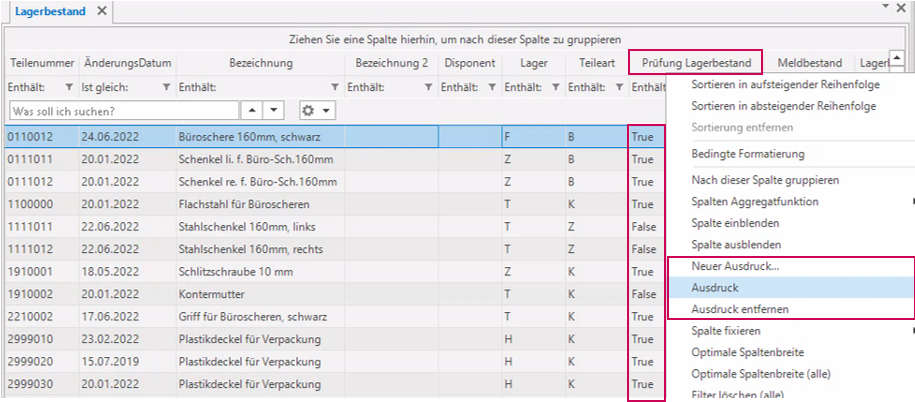 Über den Menüpunkt „Ausdruck“ kann dieser nachträglich bearbeitet werden. Mit dem Menüpunkt „Ausdruck entfernen“ kann die neue Spalte auch wieder gelöscht werden.
