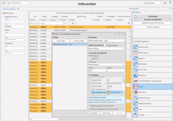 1.2 Bedienung Auswertungen können mit den vorgegebenen Werkzeugen wie der klassischen Sortierung, Filterung, Selektion und auch über einen Editor bedingt formatiert werden. In den nachfolgenden Kapiteln werden einige Einstellungen erläutert. 1.2.1 Filtern 1.2.2 Gruppierung 1.2.3 Spalten-Reihenfolge 1.2.4 Sortierung-Reihenfolge 1.2.5 Verknüpfungen 1.2.6 Editor 1.2.7 Spalten Aggregatfunktionen