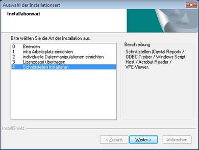 Die Installation von Schnittstellen bedient sowohl die Einrichtung von zusätzlichen Werkzeugen, wie dem CrystalReports-Viewer und dem VPE-Viewer, als auch die Möglichkeit, diese Schnittstellen durch Wiederholung der Installation ggf. zu reparieren.