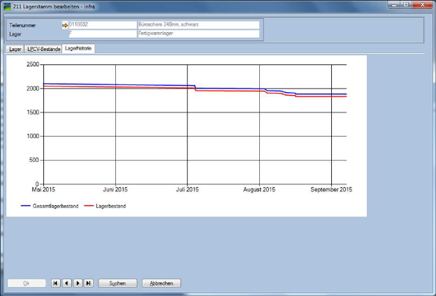 Die Ansicht der Lagerbestandshistorie im Register Lagerhistorie ist im Standard nicht enthalten und muss individuell eingebaut werden: