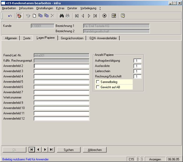 Kundennummer Rechnungsempfänger beim Kunden (anstatt der infra-Kundennummer) für Rechnungsübergabe aus Anwenderfeld 1 (Feld 61).