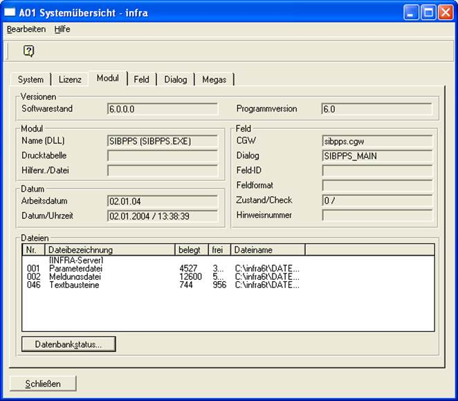 Im Modulstatus (F5) muss der Description-Eintrag aus SDBCLSRV.INI in eckigen Klammern stehen (vergleiche Screenshot-Beispiel: „[INFRA-Server]“ ).