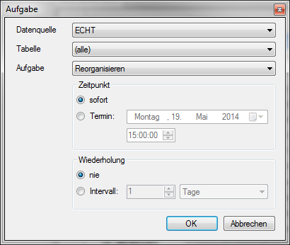 Um eine Aufgabe auszuführen oder für eine spätere oder wiederholte Ausführung vorzumerken, wird in der Management-Konsole mit „rechter Maus“ entweder auf den Namen der Datenquelle im entsprechenden Baum oder einer markierten Datei im rechten Bereich der Datenquellenansicht geklickt und zum Beispiel über „Aufgaben – Reorganisieren“ ein Dialog zur Bearbeitung der Aufgabe geöffnet. Hier kann noch einmal die auszuführende Aufgabe, die betroffenen Datenbankdateien und ein Zeitplan für die neue Aufgabe angepasst werden.