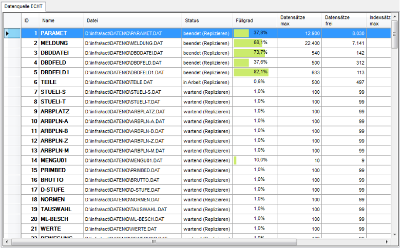 Der Status einer Datenbankdatei wird auch im rechten Bereich der Datenquellenansicht angezeigt - allerdings nicht automatisch aktualisiert. Über das Kontextmenü kann die Ansicht manuell aktualisiert werden.