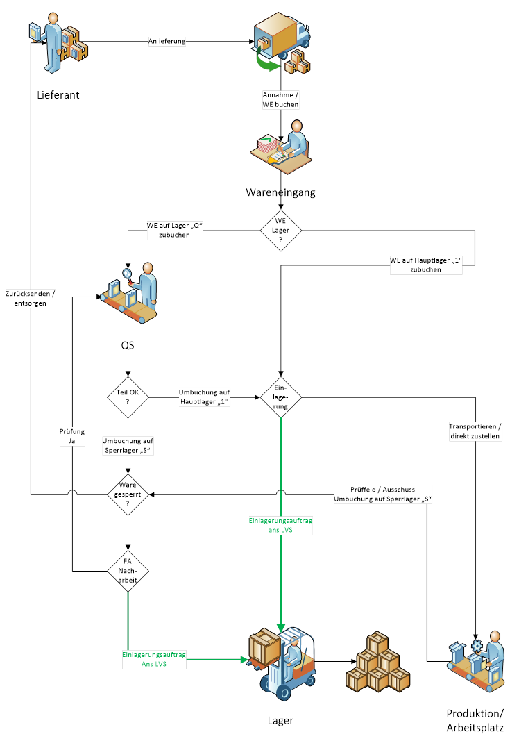 QS-pflichtige Teile werden in der QS-Abteilung geprüft. Diese Teile sind durch das Programm EKA742 auf das Lager Q gebucht worden. Nicht beanstandete Teile werden von einem QS-Mitarbeiter von Lager „Q“ auf Lager „1“ umgebucht. Durch diese Umbuchung muss ebenfalls ein Einlagerungsauftrag ans LVS geschickt werden.