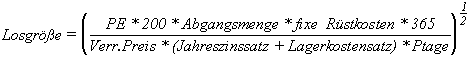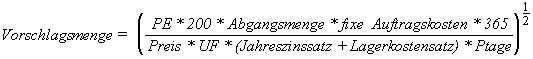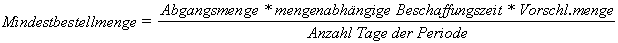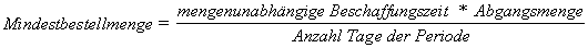 Bei Teilen, deren Beschaffungszeit mengenunabhängig ist, gilt für die Berechnung der Mindestbestellmenge der Periode folgende Formel: