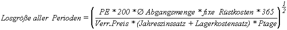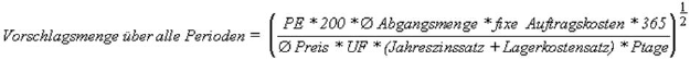 Bei der Durchschnittsberechnung über alle Perioden sind für die Variablen "Beschaffungszeit", "Abgangsmenge" und "Vorschlagsmenge" statt der Periodenwerte die Durchschnittswerte (über alle Perioden) einzusetzen.