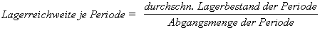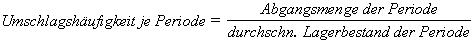 Für die Ermittlung des Durchschnittswertes über alle Perioden sind für die Variablen "durchschn. Lagerbestand" und "Abgangsmenge" statt der Periodenwerte die Durchschnittswerte (über alle Perioden) einzusetzen.