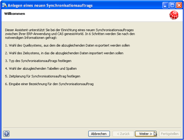 Wählen Sie auf der linken Seite des ERP connect Navigators den genesisWorld Server, für den der Synchronisationsauftrag einzurichten ist und betätigen Sie das Symbol „Neuer Synchronisationsauftrag“ in der Symbolleiste.Dadurch wird ein Assistent geöffnet, der Sie durch die Einrichtung des Synchronisationsauftrags leiten wird: