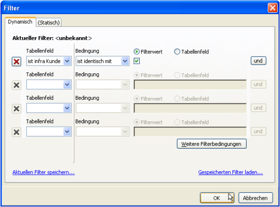 Ein Klick auf „… kein Filter gesetzt“ öffnet den Dialog zur Filterdefinition. Das zu filternde Tabellenfeld heißt „ist infra Kunde“ (ISCUSTOMER) und soll gesetzt sein: