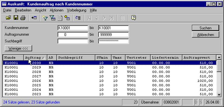 Tip: Um in einem umfangreichen Auftragsdatenbestand den aktuellsten Auftrag in der Abfrage "Kundenaufträge nach Kundennummer" am Anfang der Ergebnisliste zuverlässig angezeigt zu bekommen, sollte nicht umgekehrt nach der Spalte "Termin", sondern umgekehrt nach "Auftragsnummer" sortiert werden.