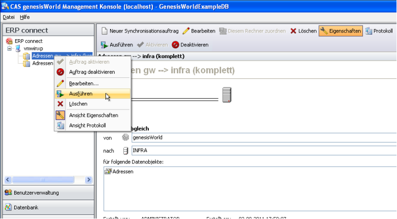 Ein Synchronisationsauftrag ohne Wiederholungsschema muss manuell gestartet werden. Dazu wird im ERP connect Navigator der betroffene Synchronisationsauftrag markiert und der Eintrag „Ausführen“ in der Symbolleiste betätigt (alternativ über das Kontextmenü zum Synchronisationsauftrag):