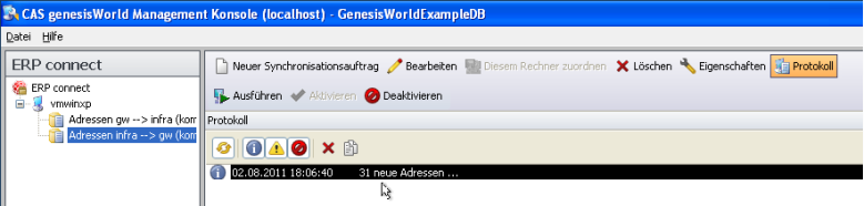 Die Ausführung eines Synchronisationsauftrags wird im ERP connect Navigator protokolliert. Das Protokoll wird durch einen Klick auf die Schaltfläche „Protokoll“ angezeigt: