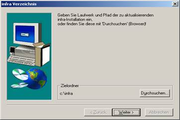 Der Pfad für das Verzeichnis der zu aktualisierenden infra-Installation wird vorbelegt aus der Registry. Der Registryeintrag stammt aus der Installation, der Einrichtung des infra-Arbeitsplatzes oder dem letzten erfolgreichen infra-SETUP an diesem PC. Die Vorbelegung kann mit ‚Weiter’ akzeptiert werden, oder das gewünschte Verzeichnis kann mit ‚Durchsuchen’ gefunden werden.