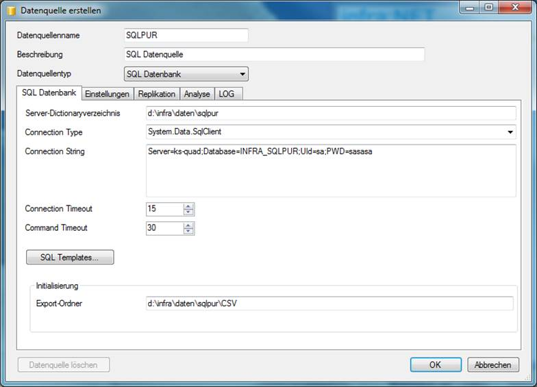Connection String mit SQL-Server, neuem SQL-Datenbanknamen und Zugangsdaten angeben – z.B. „Data Source=KS-QUAD;Initial Catalog=INFRA_SQLPUR;User Id=sa;Password=sasasa“