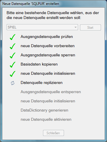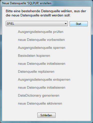 In der Auswahlliste die „native“ Datenquelle wählen, aus der die Daten für die neue SQL-Datenquelle kopiert werden sollen. Nach „Start“ führt der Assistent alle notwendigen Einrichtungsschritte zur Erzeugung derneuen SQL-Datenquelle durch: