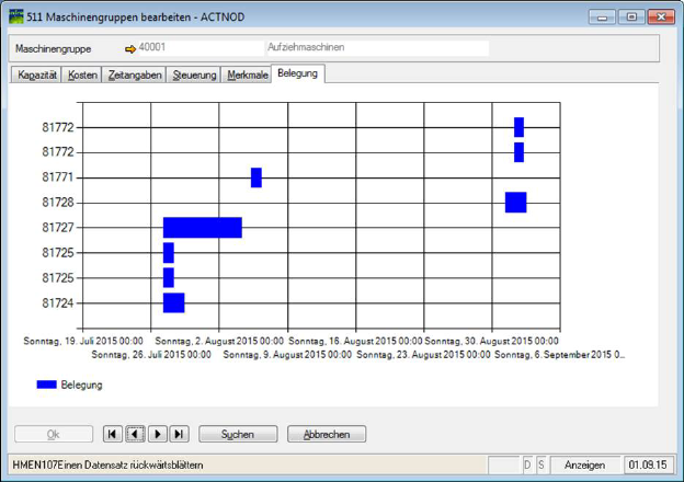 Im neuen Register werden die Belegungsdaten laut den noch nicht erledigten Arbeitsgangpositionen als Zeitbalken-Diagramm angezeigt. Dabei werden Arbeitsgänge mit einem Endtermin 99.99.9999 bzw. einem Endtermin, der mehr als 10 Jahre in der Zukunft liegt, nur mit einem Balken angezeigt und es werden maximal 20 noch nicht erledigte Arbeitsgänge berücksichtigt.