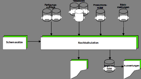 Mit der Nachkalkulation werden Fertigungsaufträge nachkalkuliert. Das Ergebnis ist eine Gegenüberstellung der Soll- und Ist- Kosten. Grundlage hierfür bilden die Fertigungsaufträge und deren Rückmeldungen.