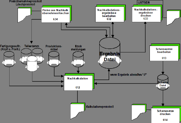 Bei der Kalkulation einzelner Fertigungsaufträge werden der Materialeinsatz (M-Zeilen im Auftrag als Soll, Rückmeldungen zu M-Zeilen als Ist), der Arbeitseinsatz (A-Zeilen im Auftrag als Soll, Rückmeldungen zu A-Zeilen als Ist) und zusätzliche ungeplante Kosten (Rückmeldungen IST) errechnet und summiert. Zusätzlich werden Gemeinkosten und Zuschläge aus der Schemadatei (613 Schemasätze bearbeiten) berücksichtigt.
