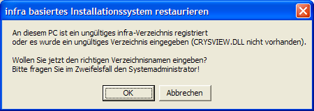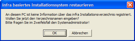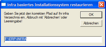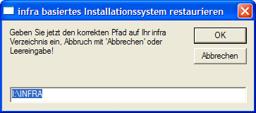 Die Eingabe des Laufwerks und des kompletten Pfades auf das infra-Verzeichnis (vorbelegt ist I:\INFRA) muss mit OK bestätigt werden,mit „Abbrechen“ wird die Installation ohne Ergebnis abgebrochen.Ebenso ergebnislos abgebrochen wird, wenn eine leere Eingabe gemacht wird.
