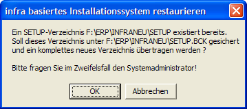 Es wird solange zur Eingabe des korrekten infra-Verzeichnisses aufgefordert, bis der Check erfolgreich ist, oder abgebrochen wird.Wenn ein gültiges infra-Verzeichnis gefunden wird, unter dem ein SETUP-Verzeichnis existiert, wird gemäß folgendem Dialog abgebrochen, oder das Verzeichnis SETUP wird umbenannt zu SETUP.BCK: