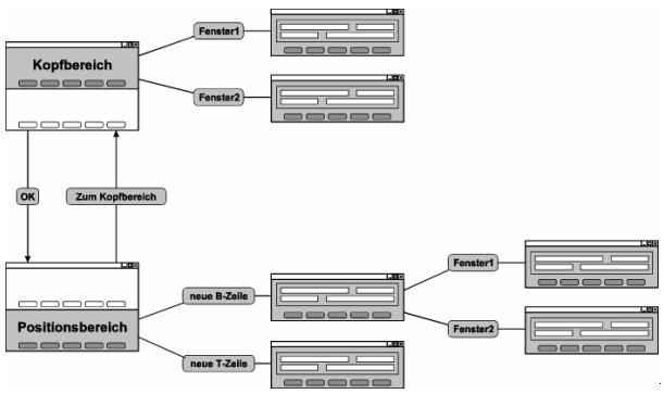 Zeilenbereich im HauptfensterIn diesem Bereich werden die Zeilen angezeigt, die in einen Kopfbereich für Texte, einen Positionsbereich und einen Abschlussbereich für Texte eingeteilt sind.Die Positionen können mit weiteren Bearbeitungsfenstern detailliert bearbeitet werden: