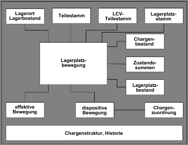 Speicherung der Bestandsmenge je Zustand über alle Plätze je Lagerort. Außerdem werden Bestandskonten zur Bewertung verwaltet. Für jeden möglichen Zustand einer Charge kann es einen solchen Satz geben.