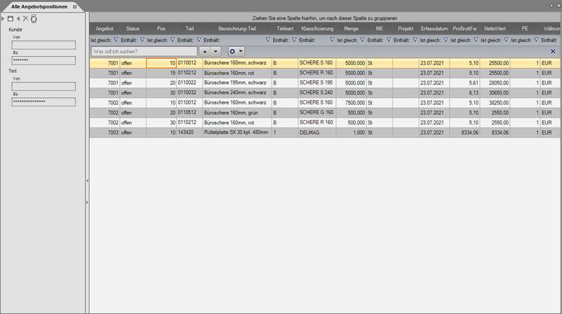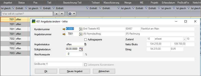 Mit Doppelklick auf eine Zeile wird in das entsprechende Angebot nach AUF431 wechselt.