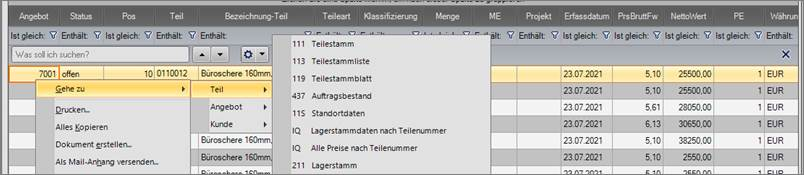In der Auswertung sind die Standard-ReportLinks der Module 111 (Teil), 431 (Angebote) und 411 (Kunde) verknüpft.