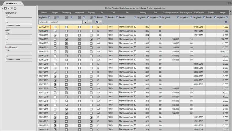 Die Auswertung zeigt das Artikelkonto analog zum Modul 321. Über die Markierungen Dispo, (Bewegung, ungeplant und Zugang) kann gesondert gefiltert werden.