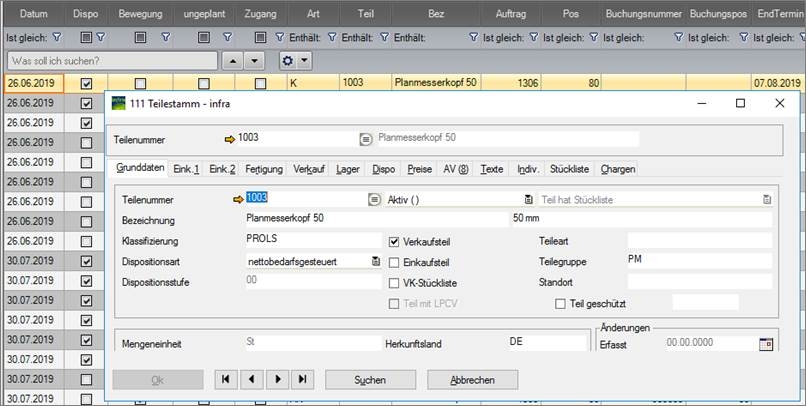 Aufträge (Dispositionen) und Lagerbewegungen eines Teils (Artikels) können hiermit aufgelistet werden