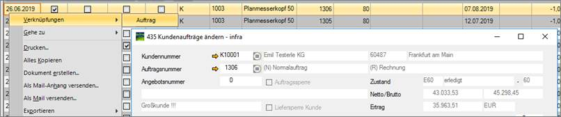 Über Verknüpfungen kann das verlinkte Modul (435 Kundenaufträge ändern) in einem weiteren Dialog geöffnet werden.