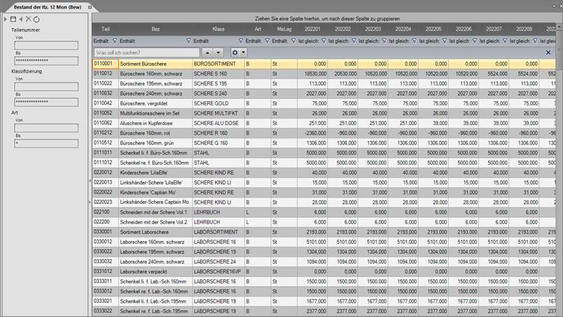 Bei der Auswertung kann nach Teilenummer, Klassifizierung und Art (Teileart) selektiert werden.