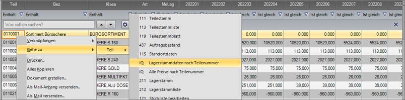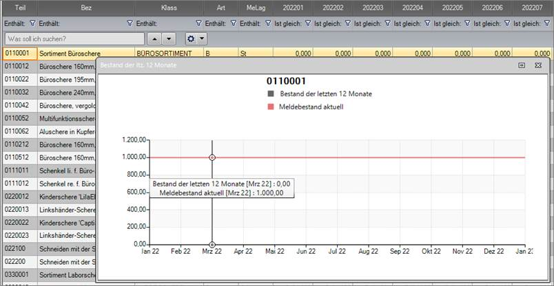 Mit Doppelklick auf eine Zeile wird in die entsprechend verlinkte Auswertung Chart (Bestand der ltz. 12 Monate) gewechselt (identisch zur Verknüpfung).