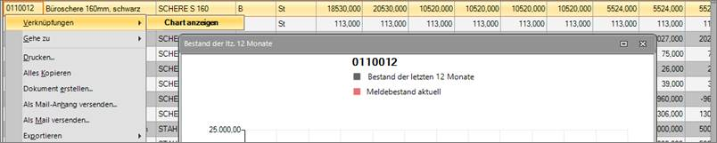 Über Verknüpfungen kann die verlinkte Auswertung Auswertung Chart (Bestand der ltz. 12 Monate) in einem weiteren Dialog geöffnet werden.