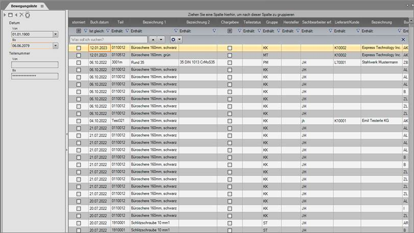 Die Auswertung zeigt die Bewegungsliste analog zum Modul 315. Zusätzlich werden in dieser Auswertung die Pseudobewegungen ausgegeben.
