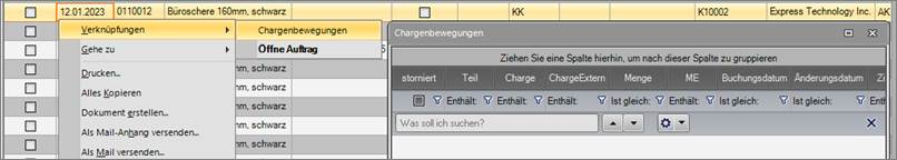 Über Verknüpfungen kann die verlinkte Auswertung (Chargenbewegung) in einem weiteren Dialog geöffnet werden.