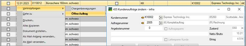 Zudem kann analog zum DefaultLink in das verlinkte Modul 435 (Kundenaufträge ändern) gewechselt werden.