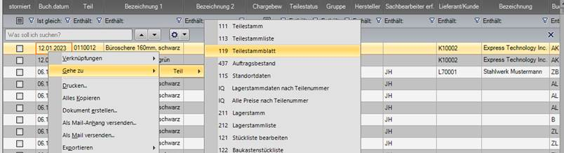 In der Auswertung sind die Standard-ReportLinks des Moduls 111 (Teil) verknüpft.