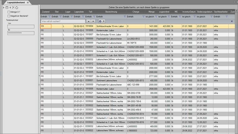 Die Auswertung zeigt die Lagerplatzbestände mit den Funktionen aus den Modulen 255 bis 259.