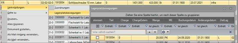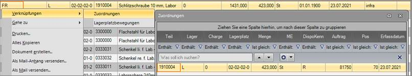 Über Verknüpfungen kann die verlinkte Auswertung (Zuordnungen, Lagerplatzbewegungen) in einem weiteren Dialog geöffnet werden.