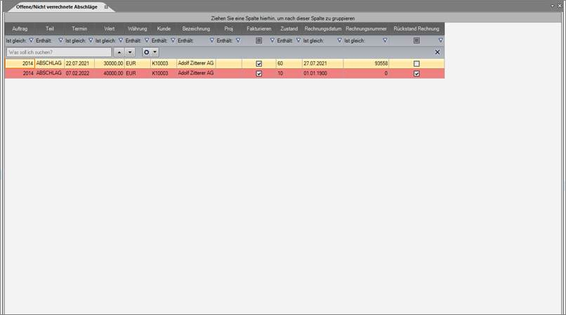Die Auswertung zeigt alle Abschläge die entweder noch nicht berechnet wurden, trotz fälligem Termin (die Ergebnisse werden in Rot abgebildet) und Abschläge für die noch keine Schlussrechnung erstellt wurde (die Ergebisse werden ohne Farbkennzeichnung dargestellt).